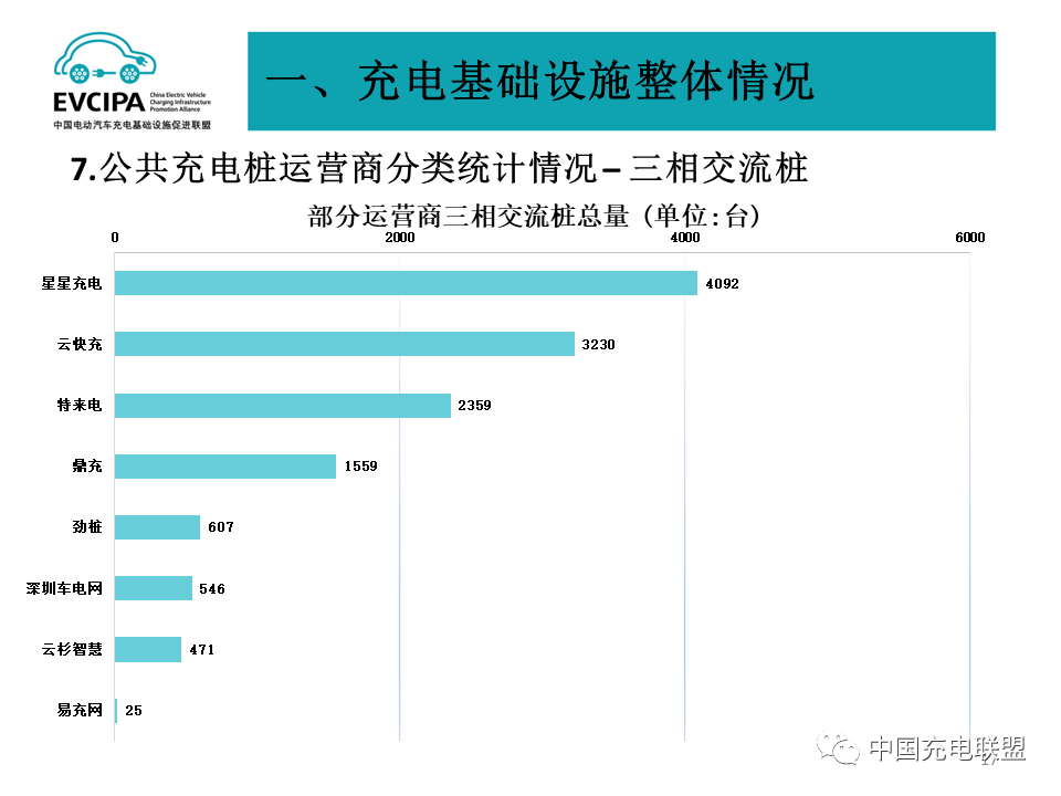公共充电基础设施运营商运行情况,截止到2022年6月,全国充电运营企业所运营充电桩数量TOP15,分别为:特来电运营28.7万台、星星充电运营28.4万台、国家电网运营19.6万台、云快充运营18.4万台、南方电网运营9.5万台、小桔充电运营7.6万台、蔚景云运营5.5万台、深圳车电网运营5.0万台、依威能源运营3.8万台、汇充电运营3.5万台、万城万充运营3.1万台、上汽安悦运营2.4万台、万马爱充运营2.3万台、中国普天运营2.1万台、蔚蓝快充运营1.4万台。这15家运营商占总量的92.5%,其余的运营商占总量的7.5%。